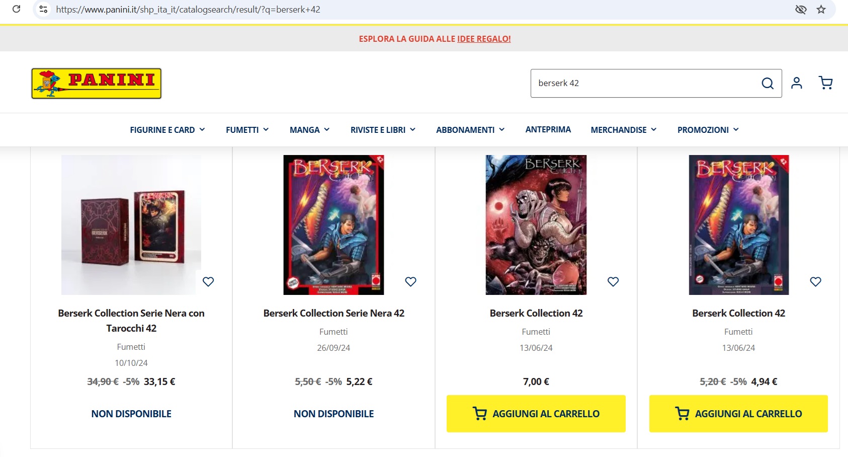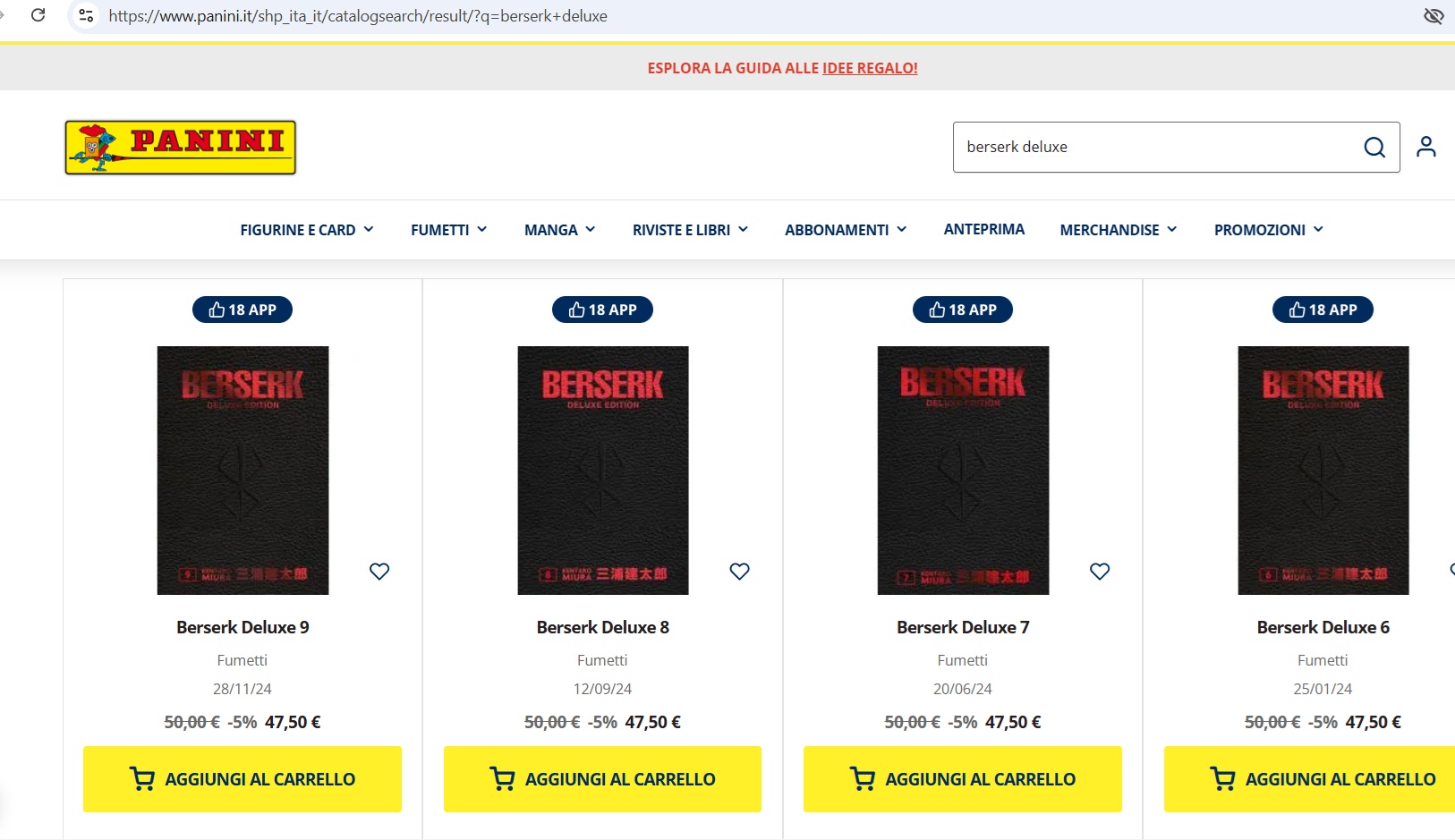 A Panini da Itália tem diversas edições de Berserk por lá. E uma delas é justamente a mesma edição deluxe da Darkhorse. Custa 50 euros. E a Panini de lá também lançou o volume #42 especial com jogo de Tarô, para uma das outras edições do mangá e saiu a 35 euros.